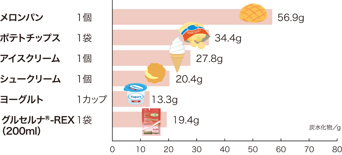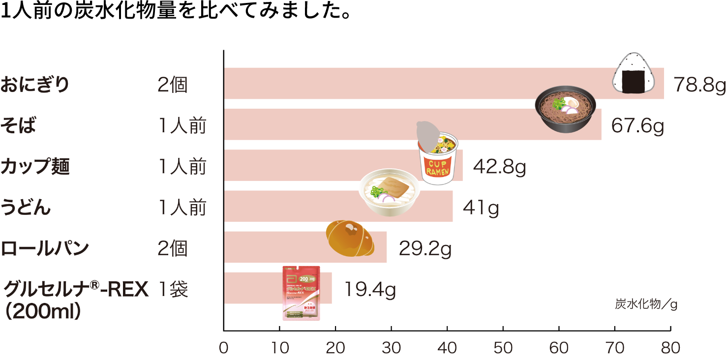 ※おにぎり(うるち米、1個100g、1人前2個)、そば(ゆで、汁なし、1人前260g)、カップ麺(油揚げ、塩味、調理後の麺、スープ残したもの、1個170g)、うどん(ゆで、汁なし、1人前190g)、ロールパン(1個30g、1人前2個)、メロンパン(1個95g)、ポテトチップス(成形、1袋60g)、アイスクリーム(普通脂肪、1個120ml)、シュークリーム(1個80g)、ヨーグルト(脱脂加糖、1個180g)として